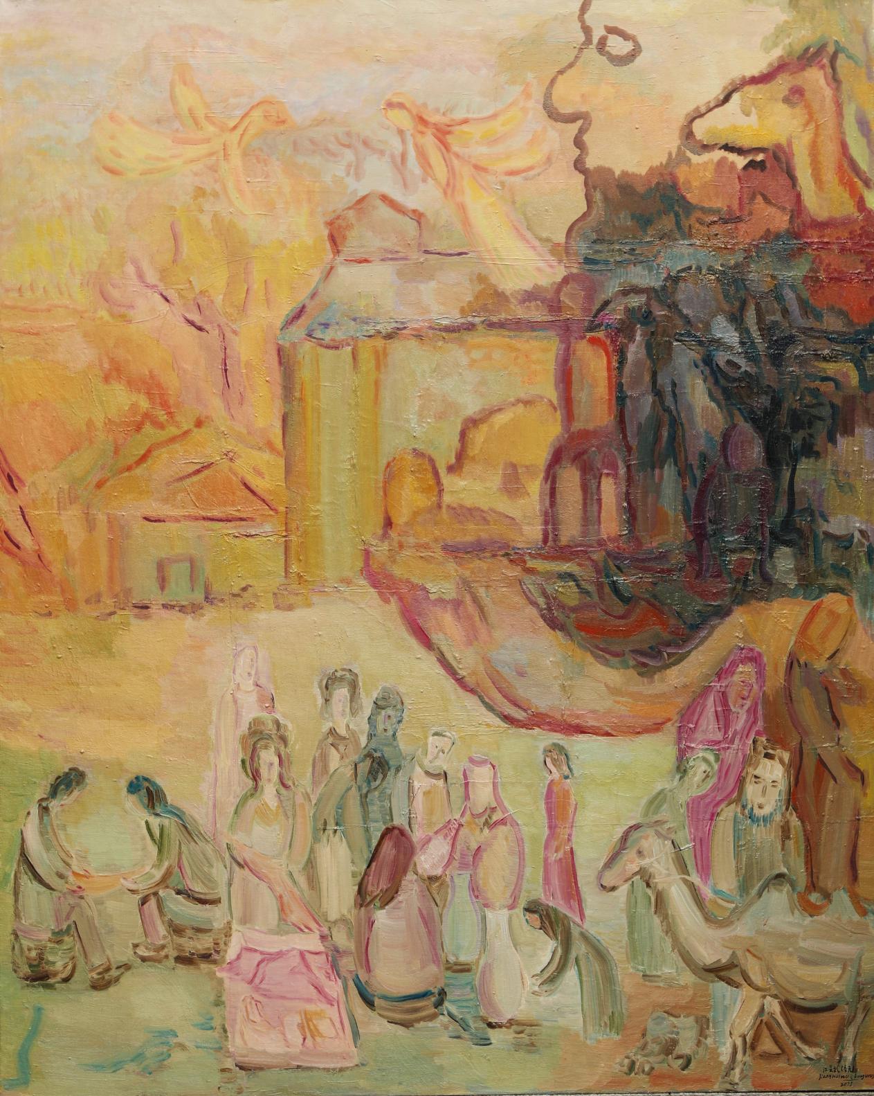 美拉德色系——赭褐、焦茶、琥珀、赭石——在画布上如被太阳炙烤过的香料,缓缓释放出矿物与火焰的味道。空无用心流鬃笔毛刷刮刀去描摹飞天、月海,让颜料本身的温度去触碰北魏的朱砂、唐代的金粉,以及阿波罗带回的月壤颗粒。敦煌的剥落与月表的陨石坑,帕米尔东的阿克苏地区龟慈也在遥相对歌此刻共享同一种裂纹:它们都是时间写给光线的情书。