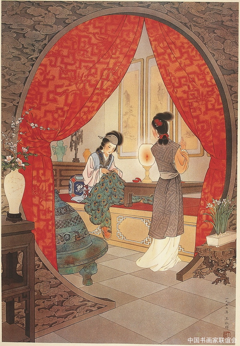 晚年的王叔晖将全部心血倾注于《红楼梦》人物的创作中,枕边放着一部翻烂的《红楼梦》, 早在1957年,王叔晖就开始创作《红楼梦》人物,一幅《晴雯补裘》蜚声海内,画面中,红帐内,烛台下,床榻上晴雯单薄的身躯、灵巧的双手和满面的病容,以及各种器物的描画,被誉为“工笔人物教科书”。