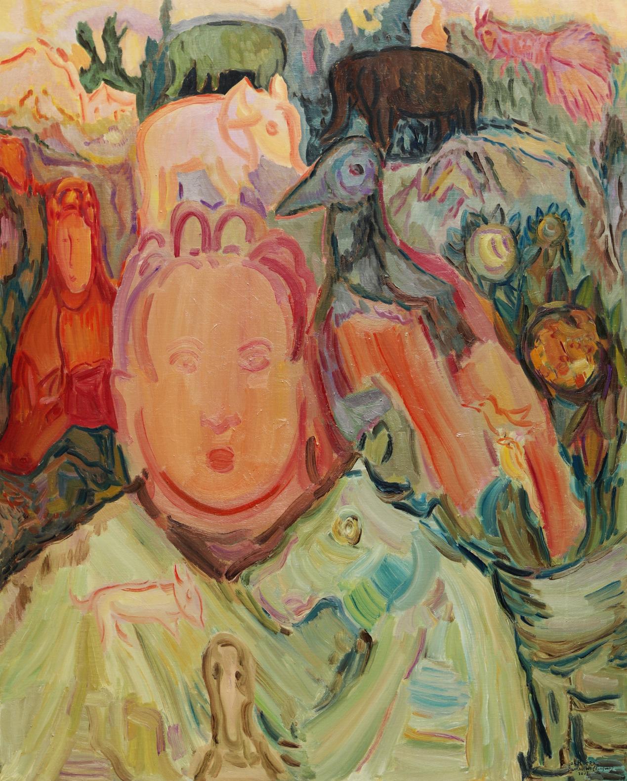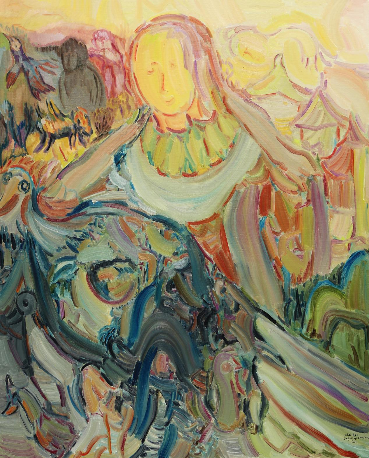 空无(江会武)的这场四个月修行,是向当代人献上的一部视觉《心经》:他以美拉德色系为舟(赭石作沙漠,暖金化佛光,棕褐凝经卷),以曲弧为楫(禁绝直线以破执念),载着我们穿越三重时空:敦煌矿物的转世、佛月悬照的真空、众生朝圣的声景。