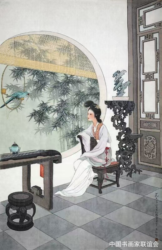 1978年,刚退休的王叔晖,又被压抑多年的红楼情结点燃了创作激情,她曾许下以“十年完成金陵十二钗”的目标愿望。66岁的王叔晖闭门谢客,十余日不眠不休,凭借对《红楼梦》原著的深刻理解,在题材上选择了“去情节化”的模糊叙事方法,一幅眉头微蹙、凝神静思的林黛玉形像诞生了,空寂的场景表现出孤标傲世的性格神韵,此时王叔晖绘画技法炉火纯青,对刻画人物精神世界的更为深沉,在后来相继创作的史湘云、薛宝钗、王熙凤、探春、迎春、李纨、元春这些极具感染力的人物形象,被公认为“最贴近原著精神的视觉表达”。直到1985年夏天,73岁的王叔晖刚绘制完成《惜春作画》线描时,画面中执笔的惜春正凝神描摹着大观园的盛景,她猝然倒于画案前,未染色的画稿上,惜春执笔凝思的身影,仿佛预示着画家与正在创作的姿态重叠,定格为残稿犹温的永恒遗憾,1985年7月23日,王叔晖在画室溘然长逝,枕边还展放着未合拢的《红楼梦》,距金陵十二钗正册仅差秦可卿、巧姐和妙玉三位人物的形象设计,给后人留下了无尽的想象空间,似待后来人。